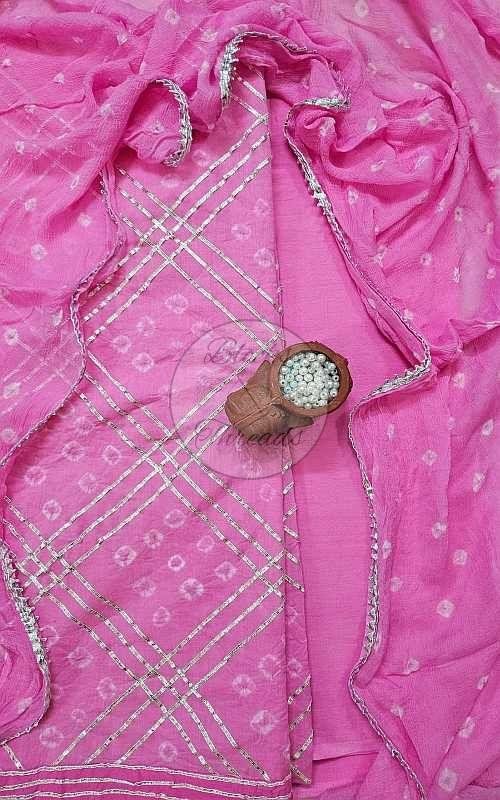 We offer a beautiful Pink Bandhani Cotton Suit Material with Mul Cotton Dupatta set, perfect for creating elegant ethnic outfits. This suit material set includes 2.45m of cotton kurta material and bottom material each, along with a 2.25m Mul Cotton dupatta in pink and white colors. Stitching facility is available for your convenience. Ideal for manufacturers and suppliers looking to provide high-quality ethnic wear. Elevate your wardrobe with this stylish and comfortable suit material set.