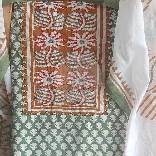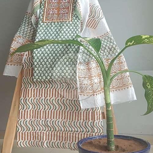 White and Green Baroda Print Cotton Suit Material
