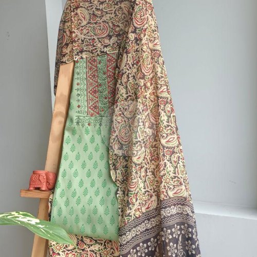 Green and Black Kalamkari Block Print Cotton Suit Material