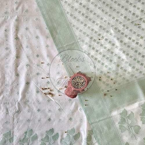 White and Light Green Cotton Banarsi Weave Suit Material