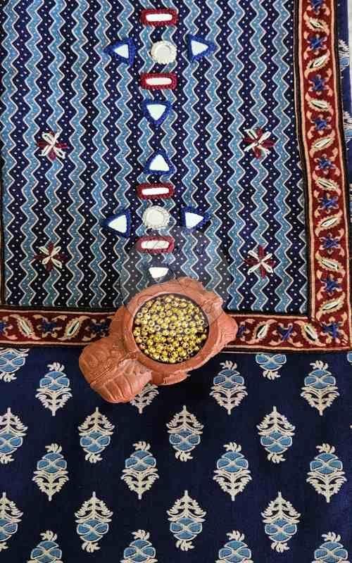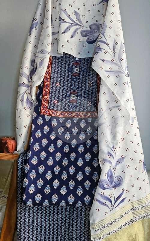 We offer a stunning Indigo Neck Yoke Gamthi Print Cotton Suit Material that includes hand-embroidered yoke detailing. This suit material set comes with a 2.35m dupatta, 2.40m kurta material length, and 2.40m bottom material length. Made from high-quality cotton, this set is perfect for those who appreciate traditional craftsmanship. The stitching facility is available for your convenience. Care instructions recommend dry clean only. Ideal for manufacturers and suppliers looking to provide exquisite ethnic wear options to their customers.